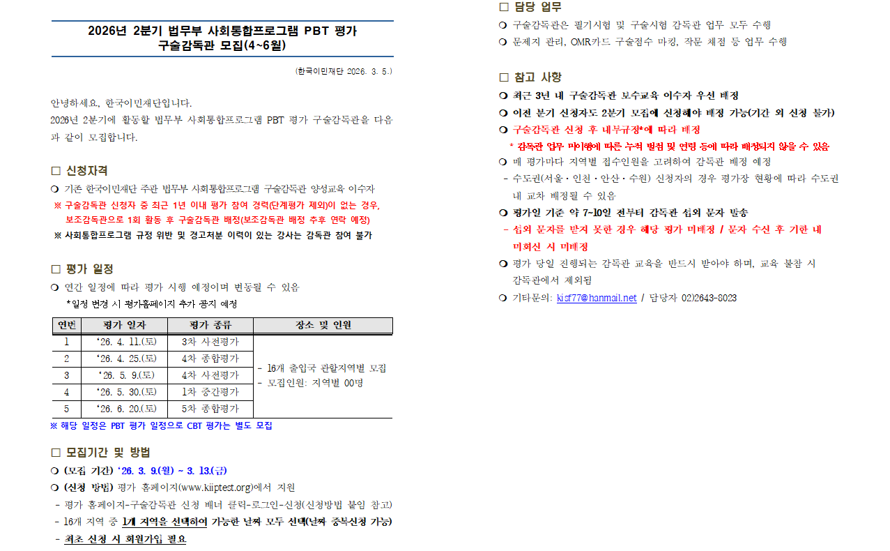 2026년 2분기 사회통합프로그램 PBT 구술감독관 모집(4~6월)